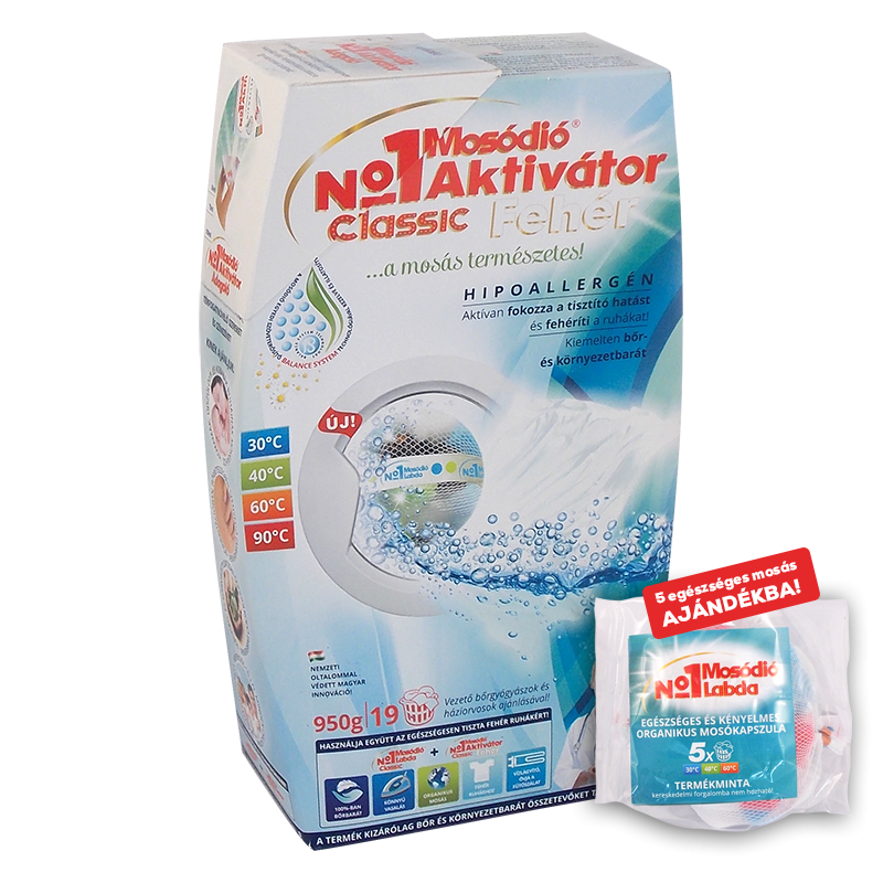 A mosódió önmagában nem fehérít, így ezt a hátrányát kompenzáltuk, egy általunk kifejlesztett és innovatív megoldással ötvözött, No1 Mosódió Aktivátor Fehér, bőr- és környezetbarát hatóanyag tartalmú aktivátorral. A fehér ruhák mosása esetében a mosódió hatásfokát - a ragyogóan fehér ruhák eléréséért - mindenképpen aktiválnunk kell, ezért a No1 Mosódió Labda mellé a mosógép adagolójába 50ml Mosódió Aktivátor Fehér, bőr- és környezetbarát hatóanyag tartalmú aktivátort adagolunk. Az aktivátor lényegében egy koncentrátum, amiből kevés is elegendő az adagolóba téve (50ml), mert a Mosódió Labdával hatékonyan tisztít, véd és fertőtlenít a mosás során.