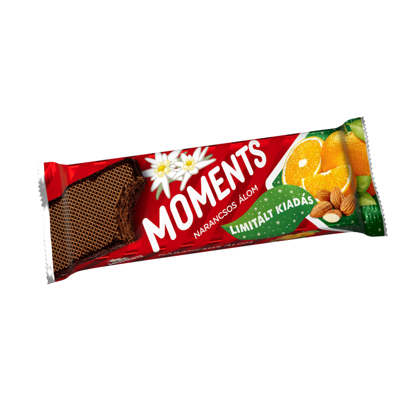 Szélein kakaós bevonómasszába mártott, mogyorós krémmel (72%) töltött ostyaszelet.