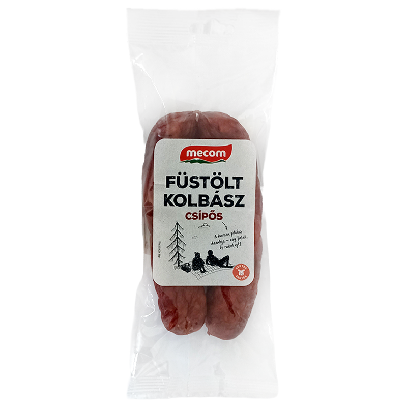 Csípős füstölt kolbász. Érlelés-szabályozóval készült félszáraz kolbász, védőgázas csomagolásban.