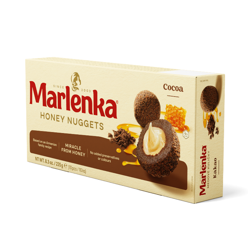 Mézes tésztából készült kakaós golyók tejkrémmel (15%) töltve, mézes morzsával borítva.