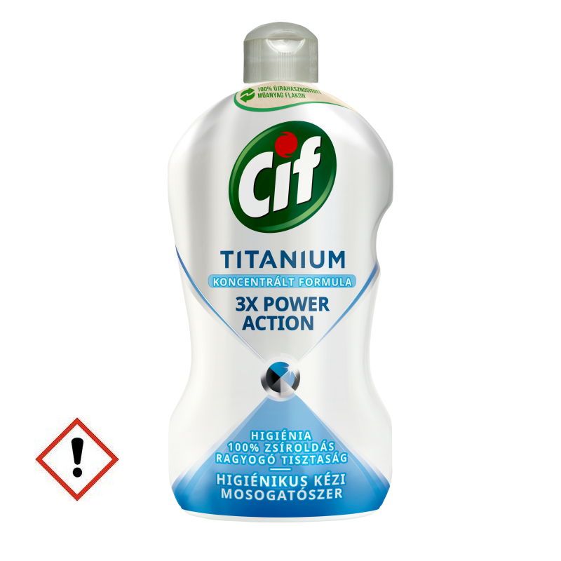 Cif Titanium Higiénikus kézi mosogatószer gyorsan és hatékonyan segít eltávolítani még a legmakacsabb zsírt és szennyeződést is, valamint segít higiénikus tisztaságot biztosítani az edényei és a mosogatószivacsa számára is. Koncentrált formula. Higiénia, 100% zsíroldás, ragyogó tisztaság!