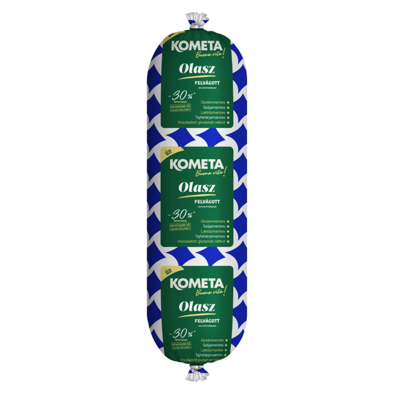 A Kometa Útravaló olasz felvágottat kilogrammos áron, nem ehető műbélben szerezheti be a Grobytól. Gondos eljárással, sertéshús felhasználásával készítik, -25% sótartalommal. A csökkentett sótartalom mellett garantált a megszokott, változatlan íz. Kitűnő termék szendvicsekhez, hidegtálakhoz. Friss péktermékekkel, sajttal, zöldségekkel fogyasztva még finomabb!