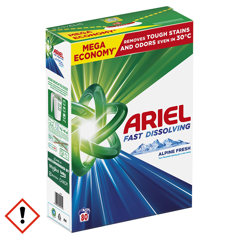 A Whirlpool, Electrolux, Candy és Beko mosógépgyártók által is ajánlott Ariel márka bemutatja az Ariel Alpine Fresh gyorsan oldódó mosóport.