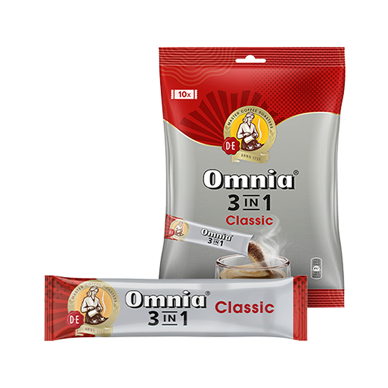 Douwe Egberts Omnia 3in1 Classic azonnal oldódó kávéitalpor cukorral, kávéfehérítővel (19%).