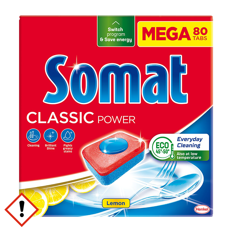 Gépi mosogatótabletta. Somat Classic - a tiszta edényekért – még alacsony hőmérsékletű ECO vagy alacsony hőmérsékletű rövid mosogatási programok használata esetén is tisztaságot és briliáns csillogást biztosít. A legjobb eredmény elérése érdekében használja Somat só és Somat öblítővel együtt. Nem alkalmas ezüst evőeszközökhöz.