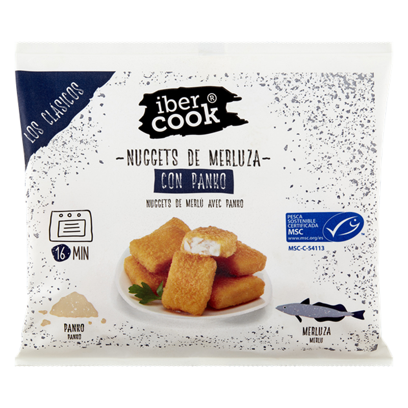 Gyorsfagyasztott pankó morzsás hekk nuggets. Elősütött, formázott termék.