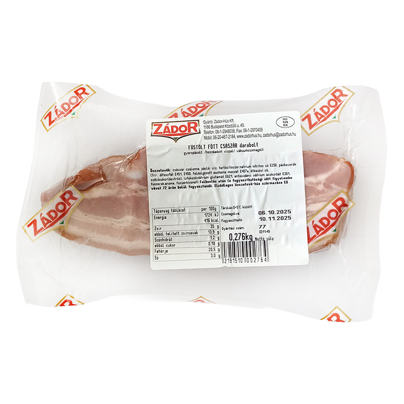 Füstölt, főtt, gyorspácolt darabolt császár (hozzáadott vízzel), vákuumcsomagolt termék.