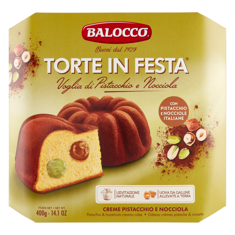 Balocco Pandoro Lampone - málnaízű csokoládékrémmel töltött természetes kelesztésű sütemény, tasakos, cukrozott zsírszegény kakaóporral a díszítéshez.