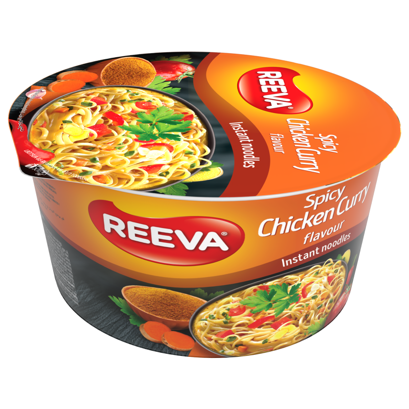 Csirkehús ízű instant tésztaleves curry ízesítéssel és szárított zöldségekkel.