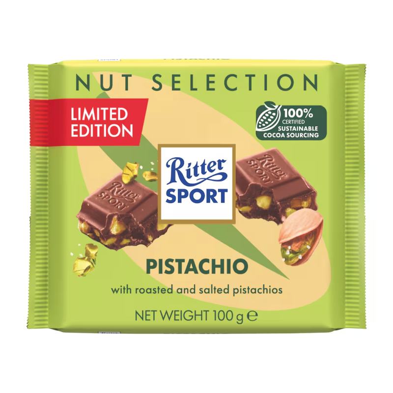 A Ritter Sport Pistachio egy limitált kiadású csokoládé, amely a bársonyos tejcsokoládéba mártott pörkölt és sózott pisztácia intenzív ízével kápráztat el.