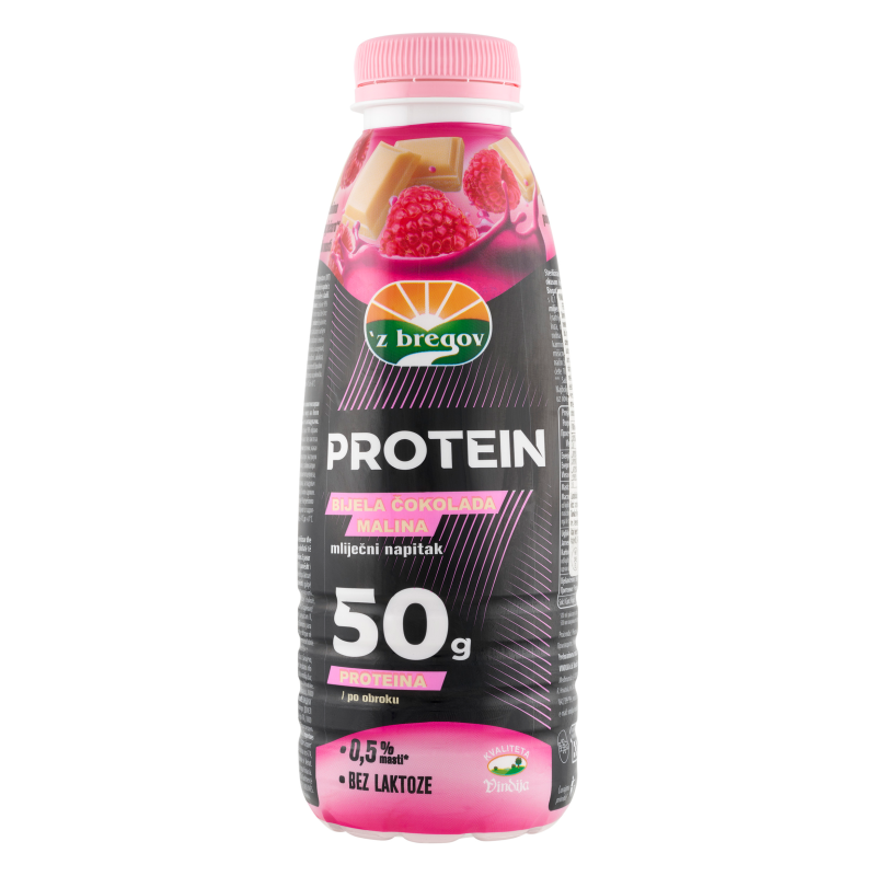 Sterilezett és homogénezett laktózmentes fehércsokoládé, málna és banán ízű protein ital édesítőszerekkel. Fogyasztás előtt felrázandó.