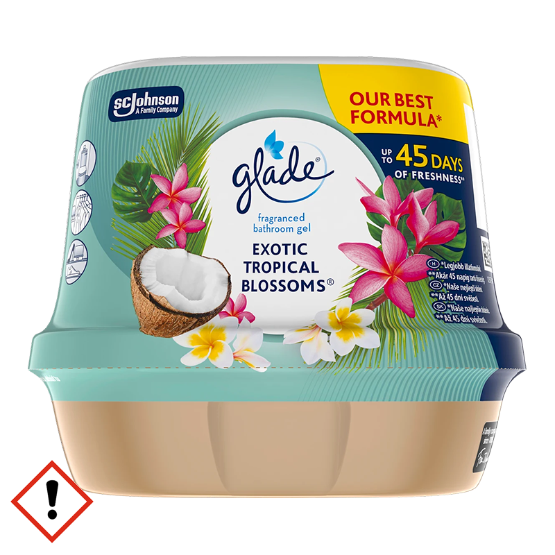 Glade Fürdőszoba zselé Exotic Tropical Blossoms illattal, mely folyamatosan biztosítja a kellemes egzotikus trópusi virág illatot akár 45 napon át.