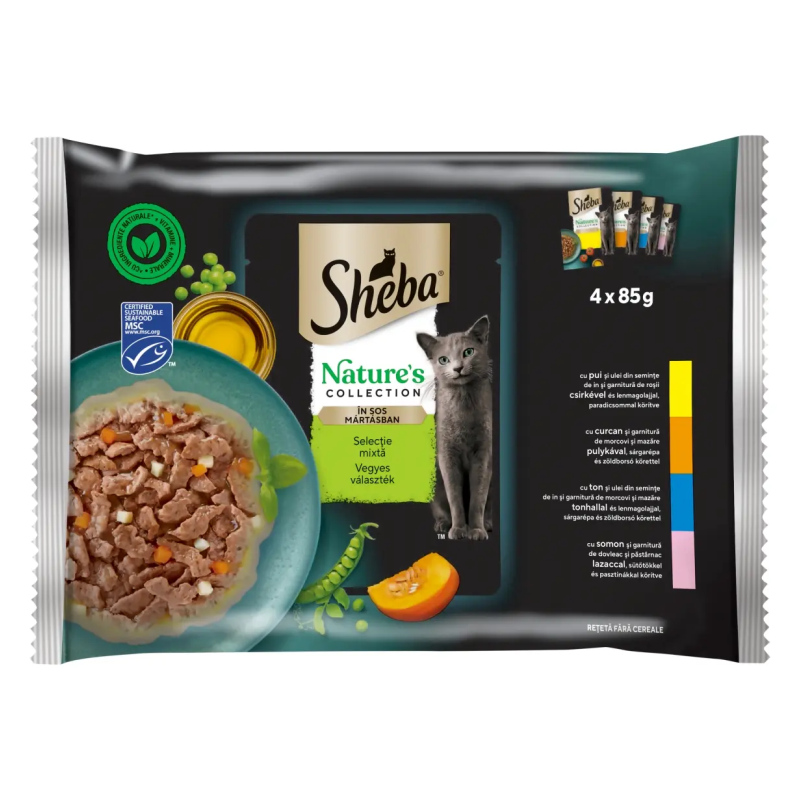 tonhallal és lenmagolajjal, sárgarépa és zöldborsó körettel: hús és állati származékok* (94%-ban természetes), hal és halszármazékok* (ebből tonhal 4% a falatokban**), növényi eredetű származékok*, zöldségek* (ebből szárított borsó és sárgarépa keveréke 1%, ami borsó és sárgarépa keverékével egyenértékű 5.6%), ásványi anyagok, élesztő*, olajok és zsírok* (ebből lenmagolaj 0.2%), különféle cukrok.