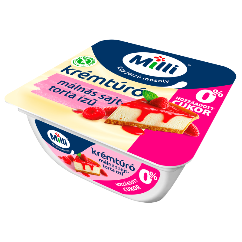 A Milli málnás-sajttorta ízű túrókrém egy könnyed, mégis élvezetes desszertalternatíva, amely a klasszikus sajttorta krémes világát friss, gyümölcsös málnás ízzel ötvözi.