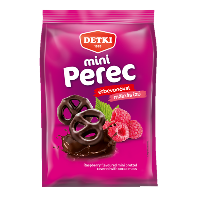 Detki mini málnás ízű perec omlós édes keksz kakaós étbevonómasszával teljesen mártva.