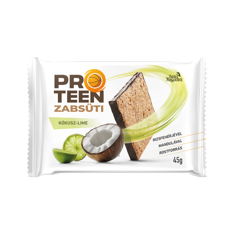 Magas fehérjetartalmú sütött zabszelet kókusszal és lime-mal, kakaós bevonó talppal.