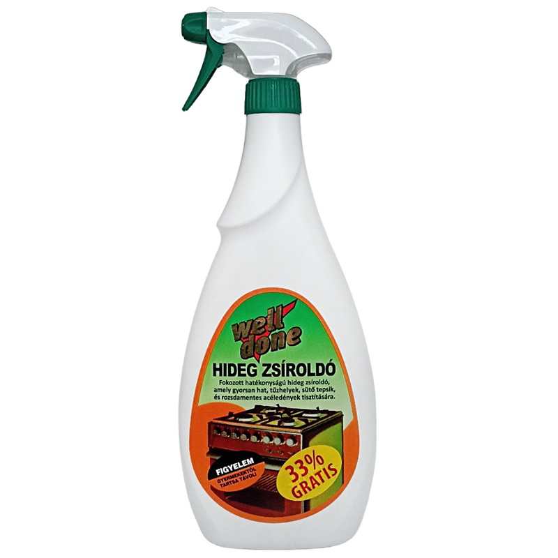 Fokozott hatékonyságú hideg zsíroldó, amely gyorsan hat, tűzhelyek, tepsik és rozsdamentes acéledények tisztítására.