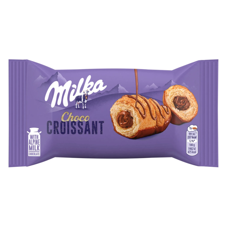 Croissant alpesi tej felhasználásával készült tejcsokoládés (2%) töltelékkel (30%), talpán alpesi tej felhasználásával készült tejcsokoládéval (18%) bevonva, alpesi tej felhasználásával készült tejcsokoládé (4%) díszítéssel.