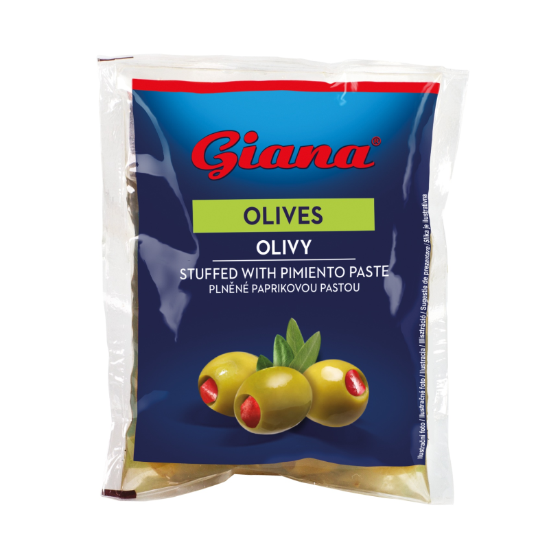 Giana zöld, magozott olívabogyó paprikakrémmel töltve, sós lében.