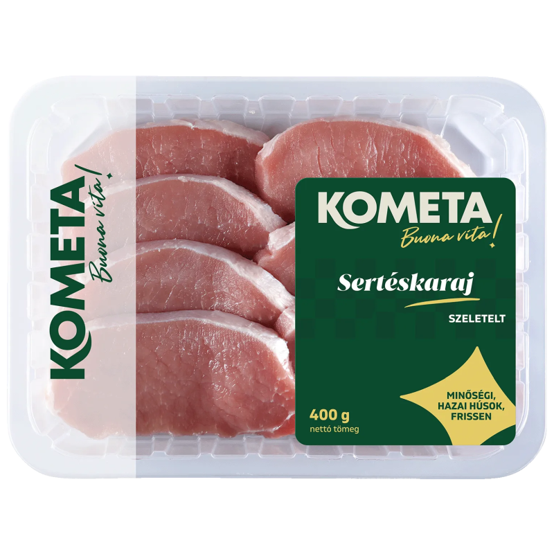 A csont nélküli, friss Kometa sertéskarajt 400 grammos, védőgázas csomagolásban szerezheti be a G'Robytól. Közkedvelt hús termék, mivel változatos elkészítési módokat rejt magában. Szaftosságának köszönhetően párolva, rántva és sütve is kitűnő ízélményt nyújt. Köretválasztás tekintetében is ideális, hiszen rizzsel, salátával, párolt zöldségekkel és burgonyával is tálalható. A nyári napokon is pompás alternatíva a kerti grillezésekhez.