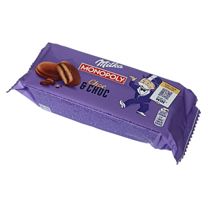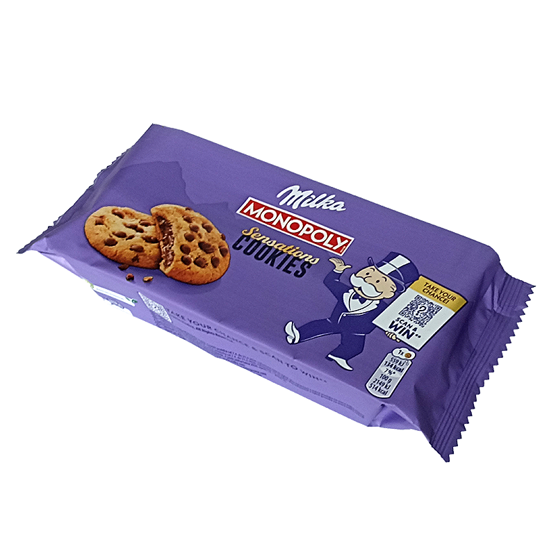 Ropogós keksz alpesi tejcsokoládé darabokkal (15,4%) és tejcsokoládés (4,5%) töltelékkel (26%).