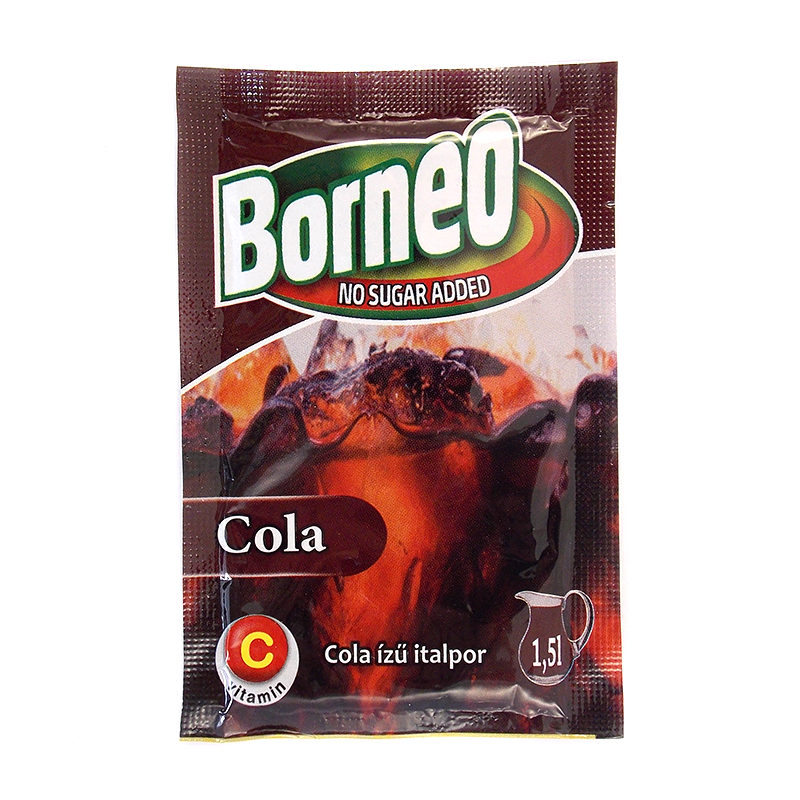 Borneo cola ízű italpor, hozzáadott cukor nélkül, édesítőszerrel. A tasak tartalmából 1,5 l üdítőital készíthető.